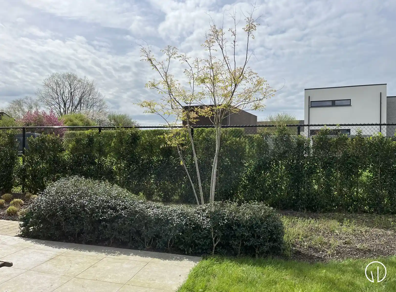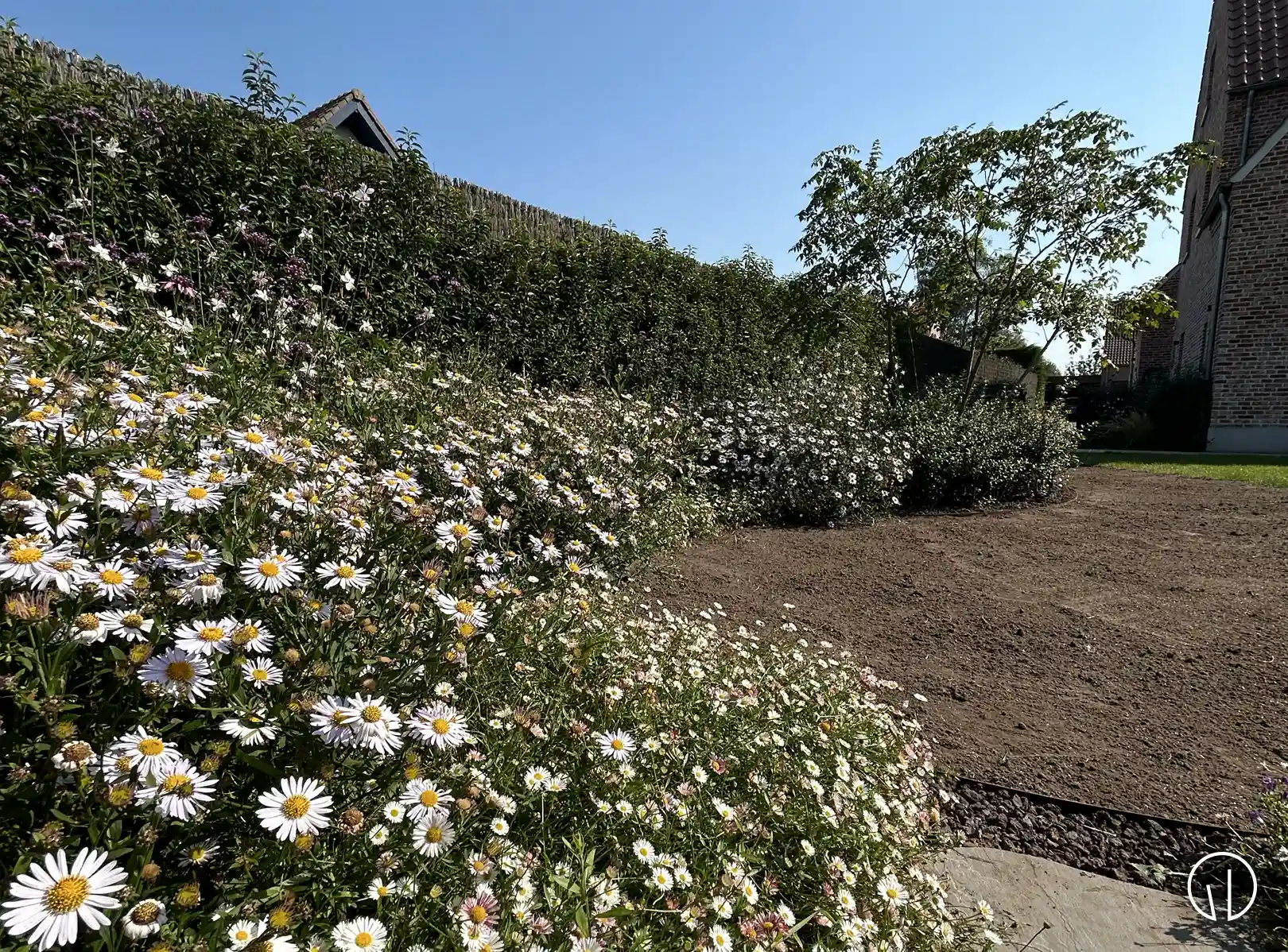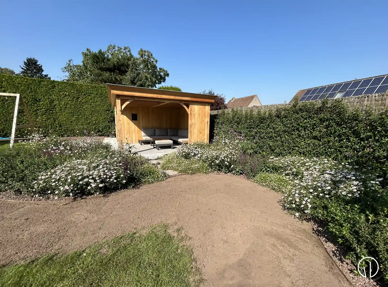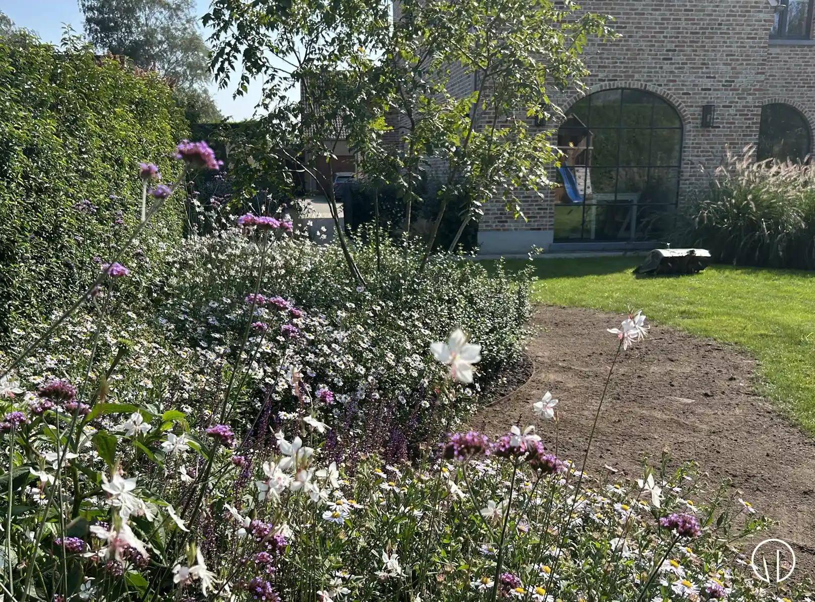 Een sfeervolle tuin vol weelderig groen en kleurrijke bloei.